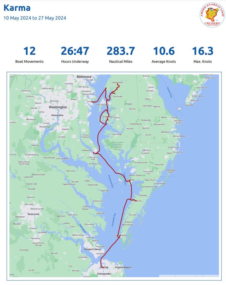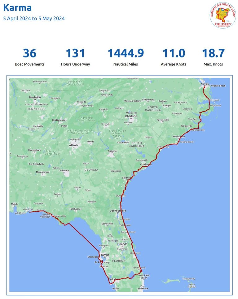 We started this adventure on April 5th and arrived at Norfolk May 5th. Our NEBO logging app says we traveled 1,445 nautical miles or 1,663 regular miles, to get here. Hours underway was 131.  I need to say, our experiences…